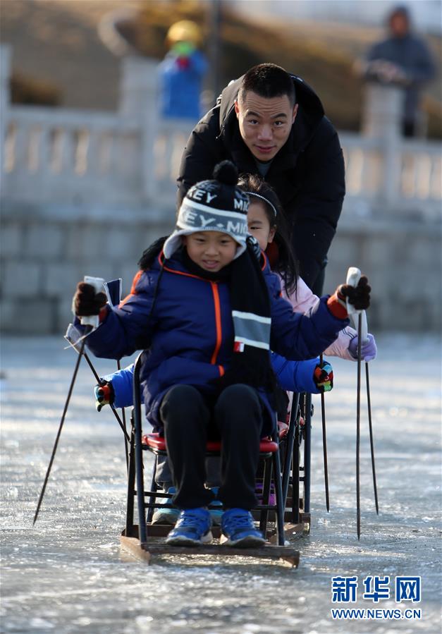 ↑1月1日,在北京玉渊潭公园,几名游客在滑冰车。 2019年新年伊始,全国各地的健身爱好者不畏冬日严寒,以丰富多样的室外运动辞旧迎新。 新华社发(雒圆摄)