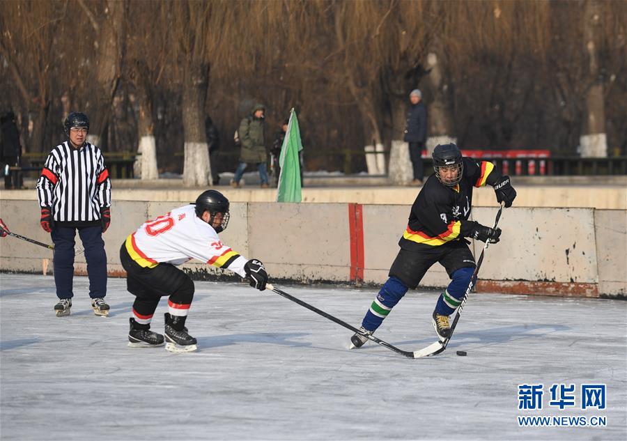 ↑1月1日,市民在辽宁省鞍山市二一九公园的冰场上打冰球。 2019年新年伊始,全国各地的健身爱好者不畏冬日严寒,以丰富多样的室外运动辞旧迎新。 新华社记者龙雷摄