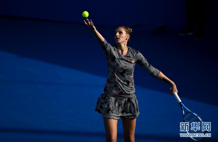 ↑1月1日,普利斯科娃在比赛中发球。 当日,在深圳举行的WTA深圳公开赛单打第一轮比赛中,中国选手彭帅在与捷克选手普利斯科娃的比赛过程中因伤退赛。 新华社记者毛思倩摄