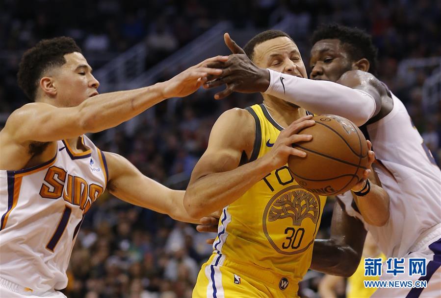↑2018年12月31日,勇士队球员库里(中)在比赛中进攻受阻。 当日,在NBA常规赛中,金州勇士队客场以132比109战胜菲尼克斯太阳队。 新华社/美联