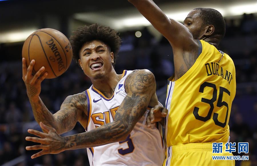 ↑2018年12月31日,太阳队球员小乌布雷(左)进攻受到勇士队球员杜兰特防守。 当日,在NBA常规赛中,金州勇士队客场以132比109战胜菲尼克斯太阳队。 新华社/美联