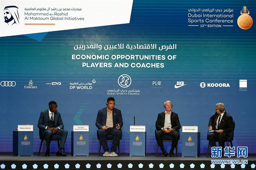 ↑1月2日,尤文图斯队球员马图伊迪(左一)和巴西传奇球星罗纳尔多(左二)、法国男足国家队主教练迪迪埃·德尚(右二)等在会议上。 当日,第13届迪拜国际体育会议在阿联酋迪拜召开,众多国际足球知名人士应邀出席。 新华社发(马哈茂德·哈立德摄)
