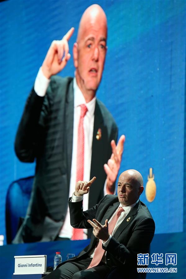 ↑1月2日,国际足联主席因凡蒂诺在会议上发言。 当日,第13届迪拜国际体育会议在阿联酋迪拜召开,众多国际足球知名人士应邀出席。 新华社发(马哈茂德·哈立德摄)