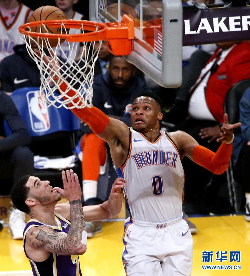 雷霆队球员拉塞尔·威斯布鲁克(右)在比赛中突破上篮。新华社发