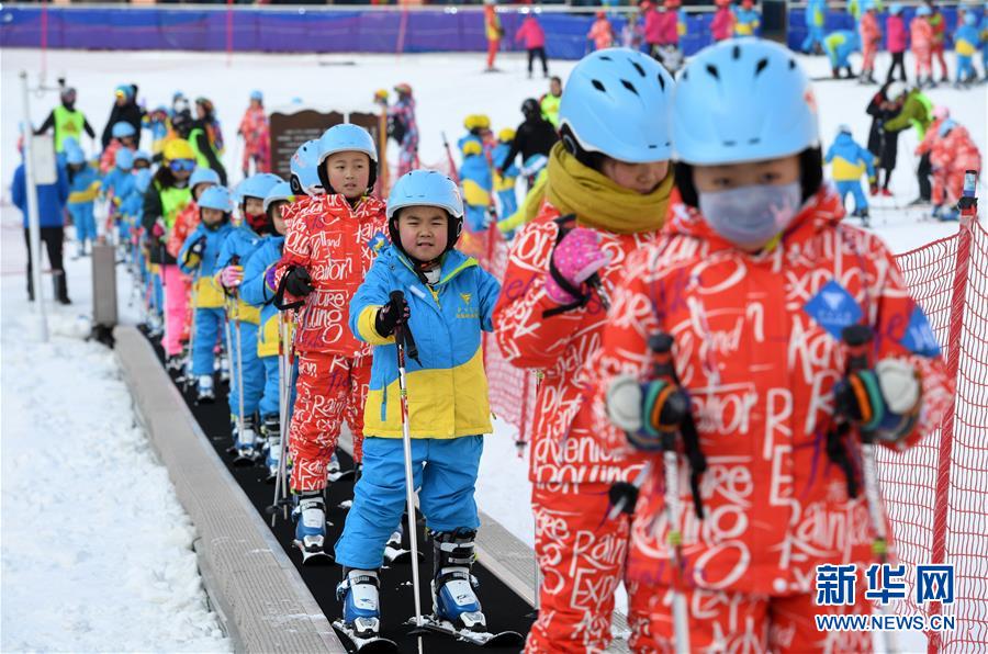 ↑1月3日,小学生们乘坐魔毯前往滑雪坡道。 新华社记者范培珅摄
