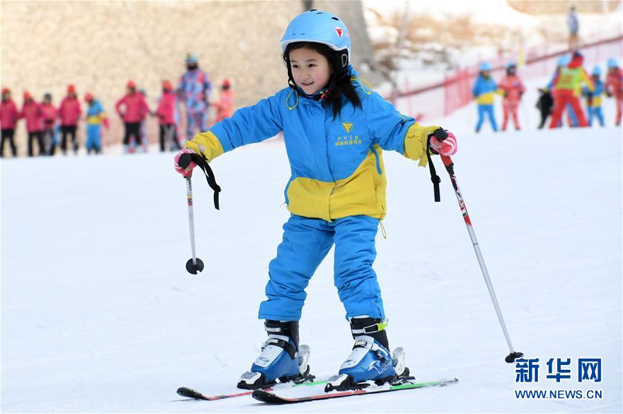 ↑1月3日,小学生在体验滑雪中。新华社记者范培珅摄