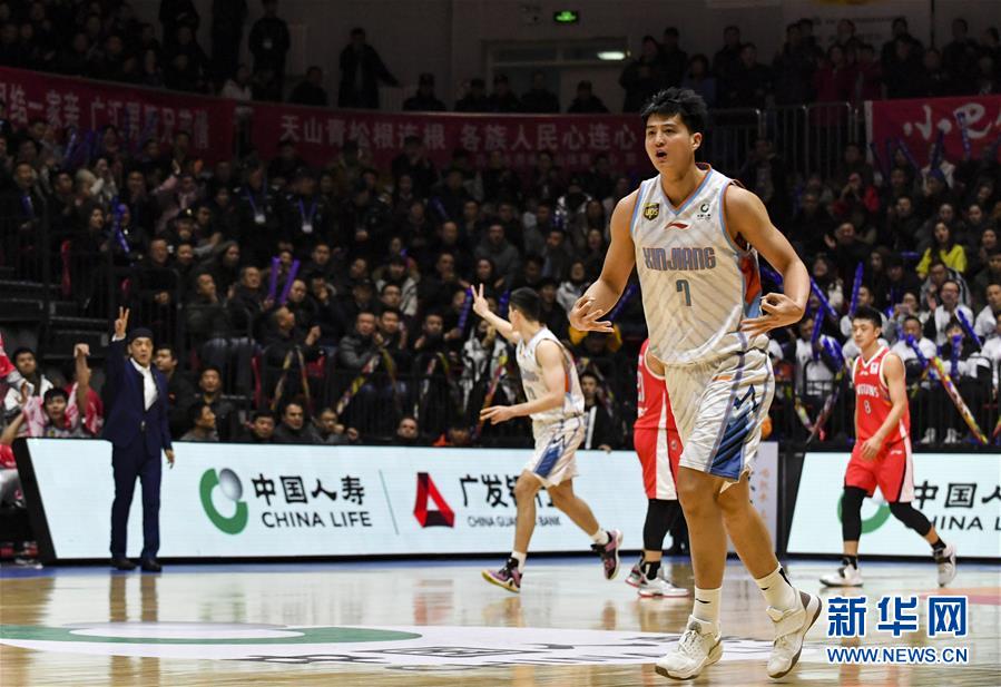 1月3日,新疆广汇汽车队球员俞长栋(前)命中关键远投球后庆祝。 新华社记者马锴摄