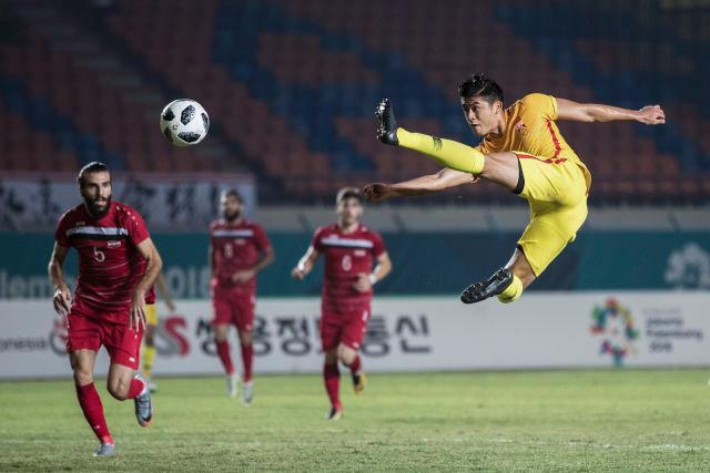 2018年8月16日,中国队球员张玉宁(右一)在比赛中射门。当日,在第18届亚运会男子足球C组小组赛中,中国队以3比0战胜叙利亚队。 新华社记者吴壮摄 图片来源:新华网