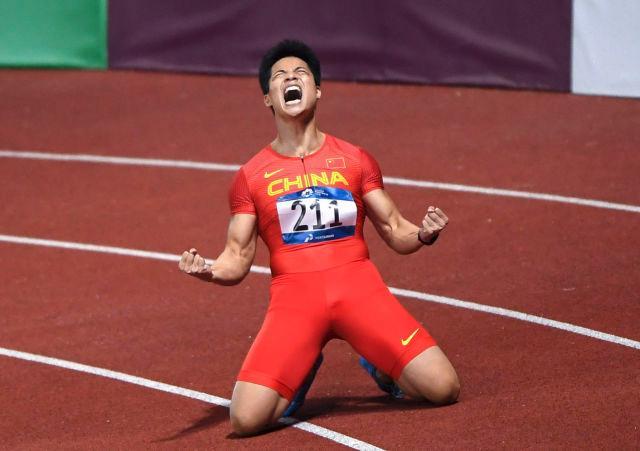 2018年8月26日,中国选手苏炳添在比赛后庆祝。当日,在第18届亚运会田径男子100米决赛中,中国选手苏炳添以9秒92的成绩获得冠军。 新华社记者潘昱龙摄 图片来源:新华网