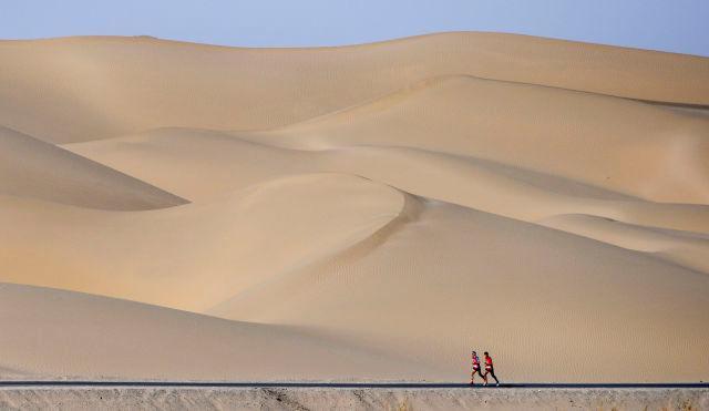 2018年10月21日,选手在沙漠半程马拉松赛中。当日,为期三天的2018中国体育旅游露营大会(罗布人村寨站)在新疆维吾尔自治区巴音郭楞蒙古自治州尉犁县落幕,活动吸引了近千名来自全国各地的户外运动爱好者参加。 新华社记者陶希夷摄 图片来源:新华网