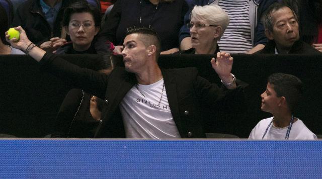 2018年11月12日,葡萄牙球星克·罗纳尔多(中)在场边抓住球员热身时飞出场的网球。当日,在英国伦敦进行的2018ATP世界巡回赛年终总决赛单打小组赛中,塞尔维亚选手焦科维奇以2比0战胜美国选手伊斯内尔。 新华社记者韩岩 图片来源:新华网