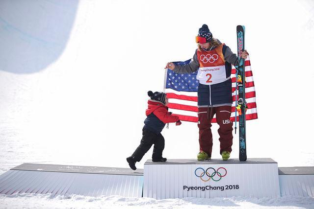 2018年2月22日,美国选手戴维·怀斯与自己的孩子在颁奖台上。当日,2018年平昌冬奥会自由式滑雪男子U型场地技巧决赛在凤凰雪上公园举行。美国选手戴维·怀斯以97.20分的成绩获得冠军。 新华社记者费茂华摄 图片来源:新华网
