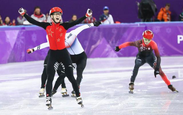 2018年2月22日,武大靖在比赛后庆祝。当日,在江陵冰上运动场举行的2018年平昌冬奥会短道速滑男子500米决赛中,中国选手武大靖夺冠,这是中国代表团在本届冬奥会上的首枚金牌。 新华社记者韩岩摄 图片来源:新华网