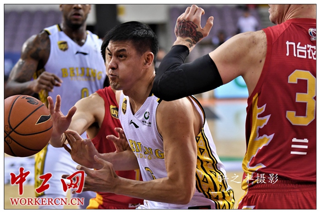 中工网讯 2019年1月6日晚,北京奥体中心篮球馆,CBA联赛第29轮比赛,北京农商行队主场以97比110负于吉林九台农商银行队(四局的比分是28比25,29比24,19比38,21比23),第29轮之后吉林队排名第10位,北京农商行排名第19位。图为双方的比赛瞬间。工人日报-中工网许之丰摄影报道