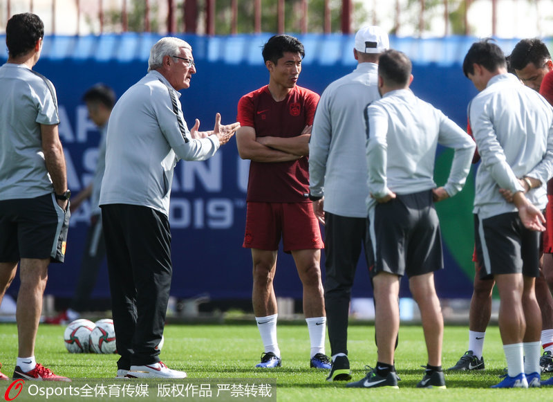 人民网北京1月9日电(李乃妍) 北京时间1月8日,中国男足国家队在主教练里皮的带领下,照常进行亚洲杯小组赛备战。由于武磊在小组赛首轮对阵吉尔吉斯斯坦的比赛中肩部受伤,他能否出战小组赛次轮迎战菲律宾的比赛成疑。好在目前他已经能够跟随国足进行热身训练,而主帅里皮也在训练间隙关切爱徒的伤情。