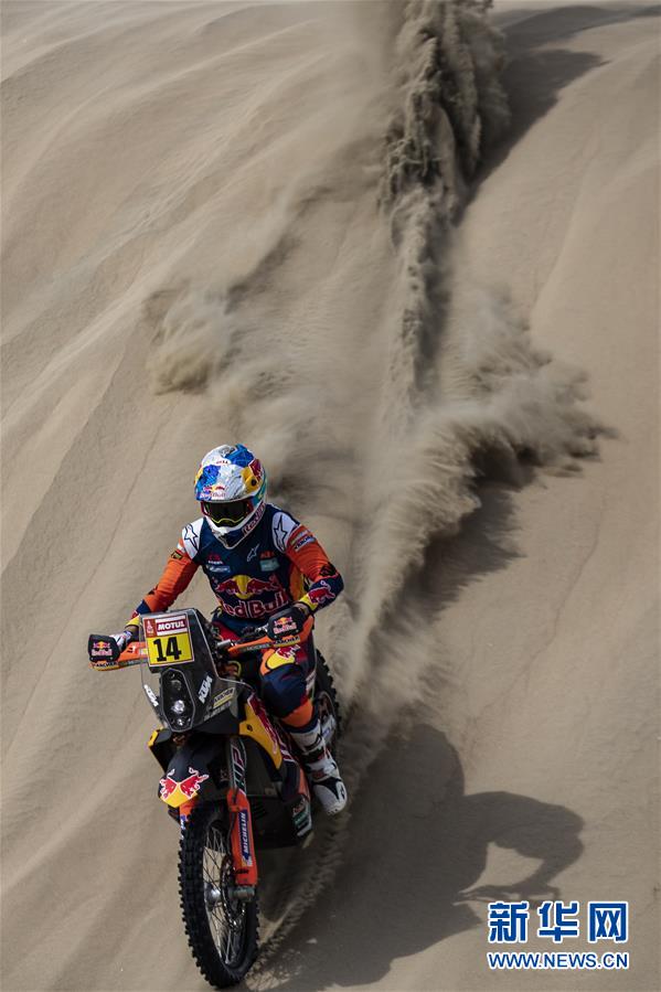 英国车手桑德兰在第二赛段比赛中,他以3小时30分00秒的成绩获得该赛段摩托车组第六名。新华社记者李明摄