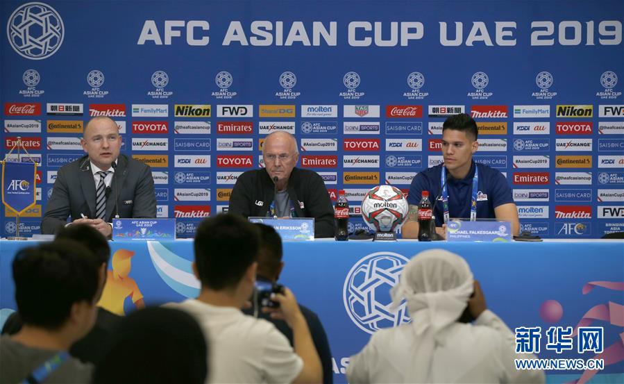 1月10日,菲律宾队主教练埃里克森(中)在发布会上。 当日,菲律宾男子足球国家队在阿联酋阿布扎比举行赛前新闻发布会,介绍备战2019年亚洲杯足球赛小组赛对阵中国队比赛的情况。 新华社记者丁旭摄