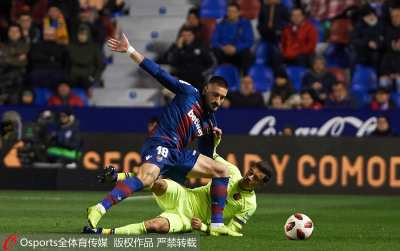 人民网北京1月11日电 北京时间1月11日04:30,2018/19赛季西班牙国王杯1/8决赛首回合一场焦点战在瓦伦西亚市政球场展开争夺,巴塞罗那客场1比2不敌莱万特,卡巴科和皇马租将马约拉尔先后进球,库蒂尼奥终场前扳回一城。次回合比赛将在一周后进行。