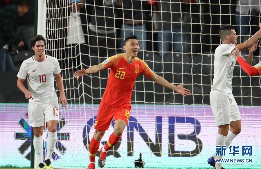 1月11日,中国队球员于大宝(中)在比赛中庆祝进球。 当日,在阿联酋阿布扎比举行的2019年亚洲杯足球赛C组小组赛中,中国队以3比0战胜菲律宾队,提前小组出线。 新华社记者 曹灿 摄