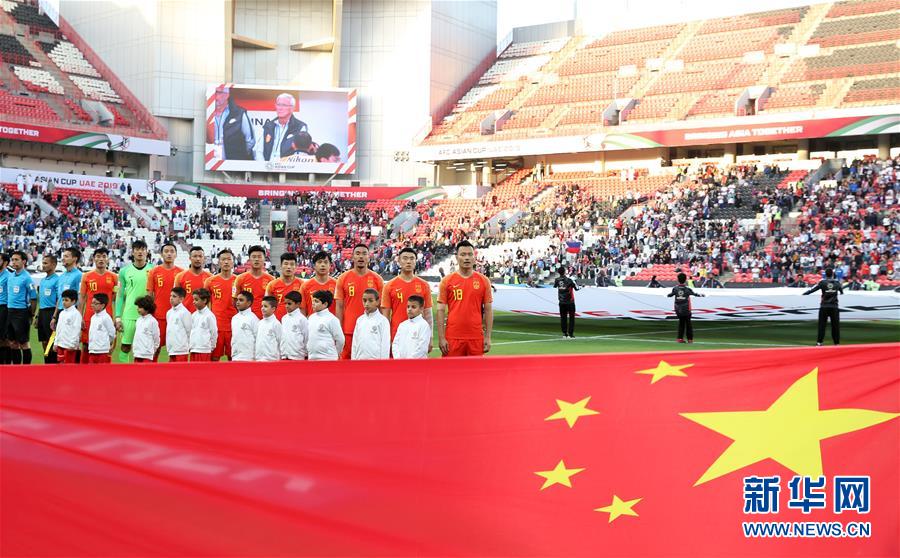 1月11日,中国队首发球员在赛前唱国歌仪式上。 当日,在阿联酋阿布扎比举行的2019年亚洲杯足球赛C组小组赛中,中国队以3比0战胜菲律宾队,提前小组出线。 新华社记者 李钢 摄