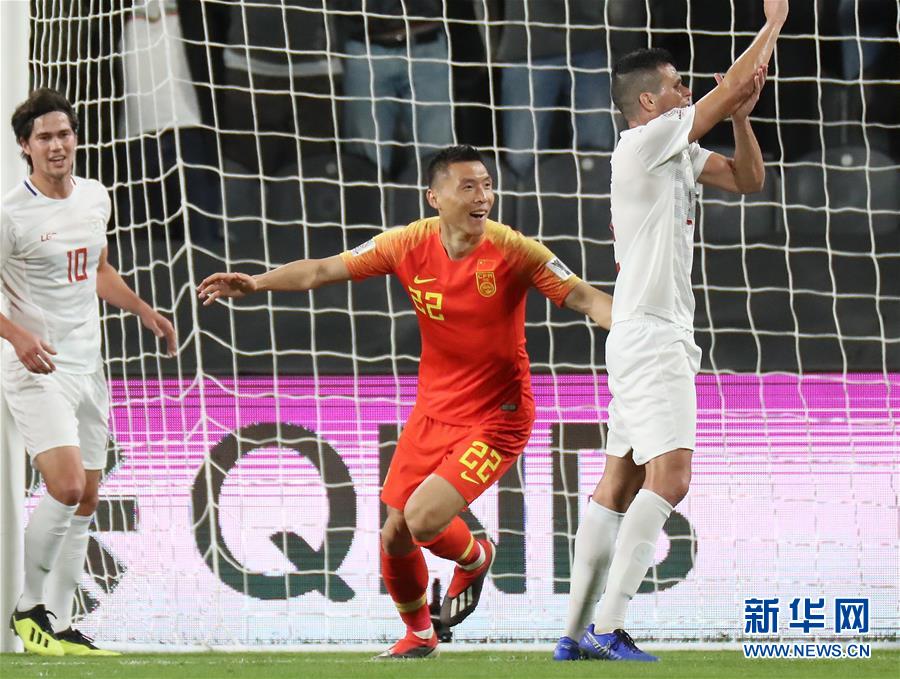 1月11日,中国队球员于大宝(中)在比赛中庆祝进球。 当日,在阿联酋阿布扎比举行的2019年亚洲杯足球赛C组小组赛中,中国队以3比0战胜菲律宾队,提前小组出线。 新华社记者 曹灿 摄