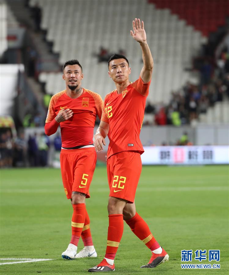 1月11日,中国队球员于大宝(右)与张琳芃在赛后向球迷致意。 当日,在阿联酋阿布扎比举行的2019年亚洲杯足球赛C组小组赛中,中国队以3比0战胜菲律宾队,提前小组出线。 新华社记者李钢摄