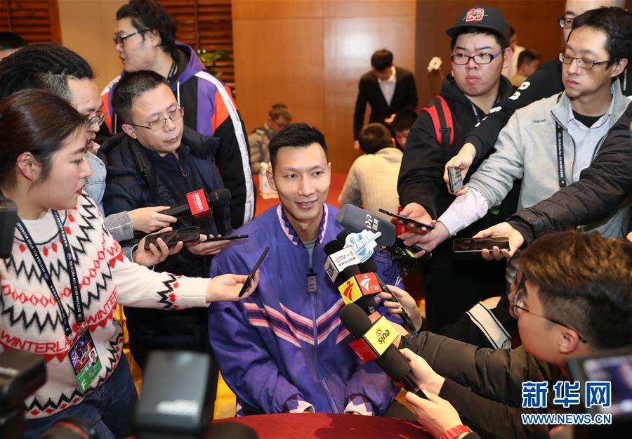 1月11日,广东东莞银行队球员易建联在活动中接受采访。 当日,参加2019年中国男子篮球职业联赛(CBA)全明星赛的首发球员在青岛接受圆桌采访。 新华社记者孟永民摄