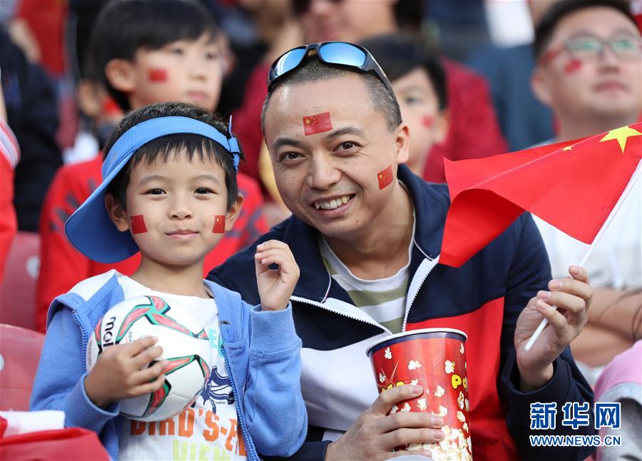 1月11日,中国球迷赛前为球队助威。 当日,在阿联酋阿布扎比举行的2019年亚洲杯足球赛C组小组赛中,中国队对阵菲律宾队。 新华社记者李钢摄