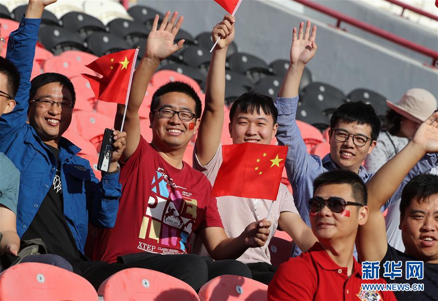 1月11日,中国球迷赛前为球队助威。 当日,在阿联酋阿布扎比举行的2019年亚洲杯足球赛C组小组赛中,中国队对阵菲律宾队。 新华社记者李钢摄