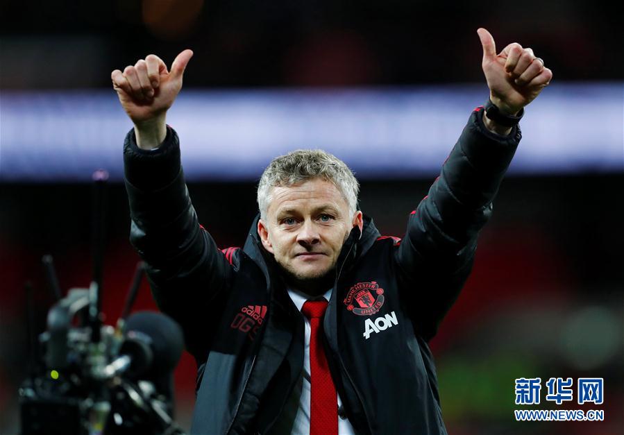 1月13日,曼联队代理主教练索尔斯克亚获胜后庆祝。 当日,在2018-2019赛季英超联赛第22轮比赛中,曼联队客场以1比0战胜热刺队。 新华社/路透