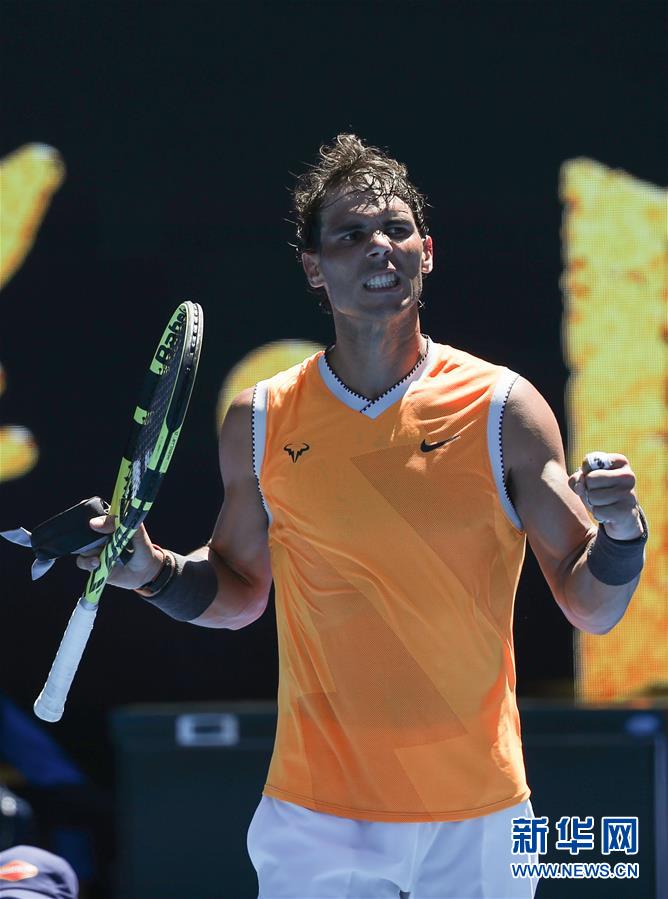 1月14日,西班牙选手纳达尔庆祝获胜。 当日,在2019澳大利亚网球公开赛男单首轮比赛中,西班牙选手纳达尔以3比0战胜澳大利亚选手詹姆斯·达克沃思,晋级下一轮。 新华社记者白雪飞摄