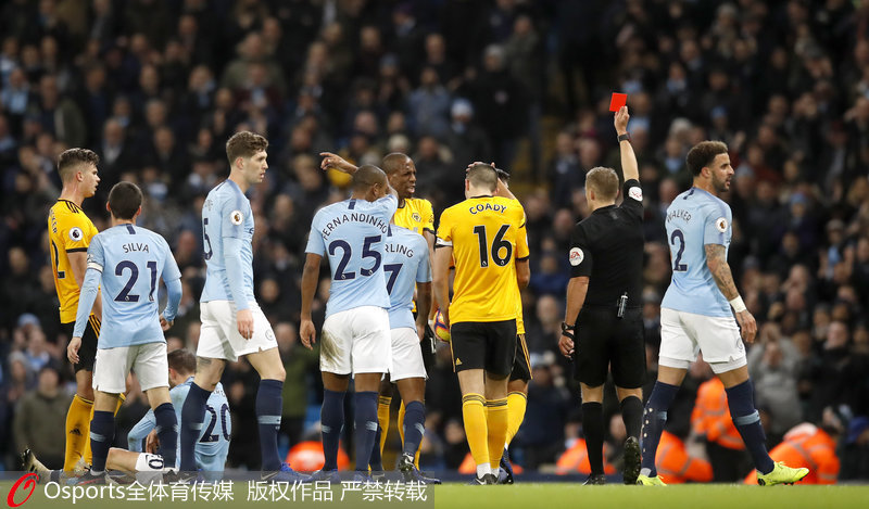 第19分钟,博利抢球时亮鞋底铲翻了贝尔纳多-席尔瓦,主裁判直接出示红牌将他罚下。