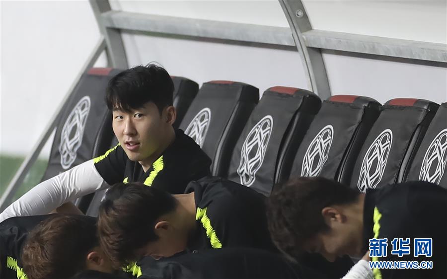↑1月15日,韩国队球员孙兴民(左一)在训练前。 当日,韩国队在阿联酋阿布扎比纳扬体育场举行赛前新闻发布会和适应场地训练。 新华社记者曹灿摄