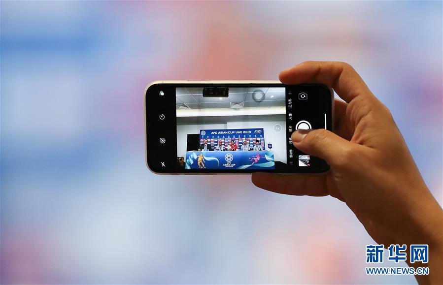 ↑1月15日,一位记者在发布会上拍照。 当日,中国队在阿布扎比纳扬体育场举行赛前新闻发布会,介绍与韩国队的小组赛备战情况。 新华社记者曹灿摄
