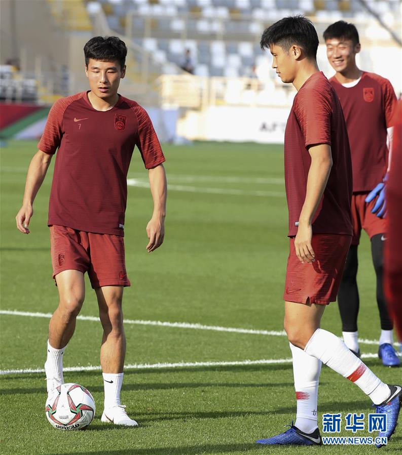 ↑1月15日,中国队球员武磊(左)在训练中。 当日,中国国家男子足球队在阿联酋阿布扎比进行场地适应训练,备战16日与韩国队进行的2019年亚洲杯足球赛C组比赛。 新华社记者李钢摄