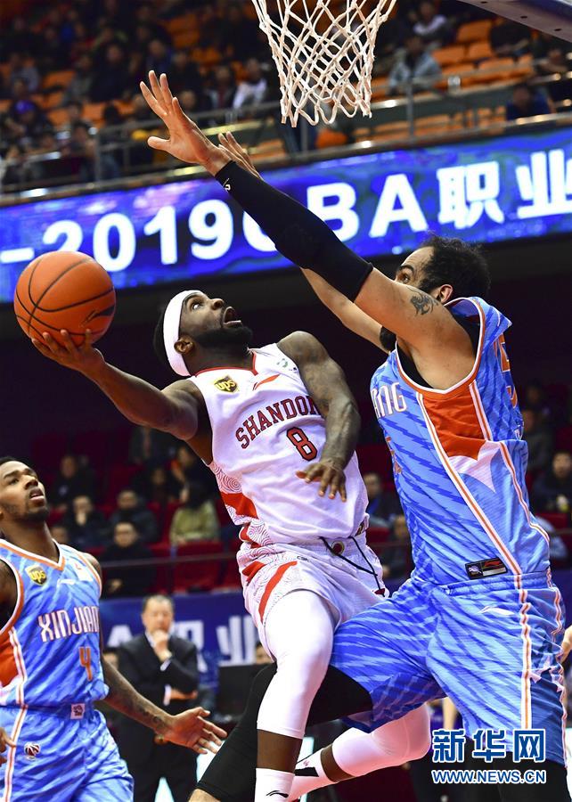 1月15日,山东西王队球员劳森(中)在比赛中上篮。 当日,在2018-2019中国男子篮球职业联赛(CBA)常规赛第31轮比赛中,山东西王队主场以126比109战胜新疆广汇汽车队。 新华社记者朱峥摄