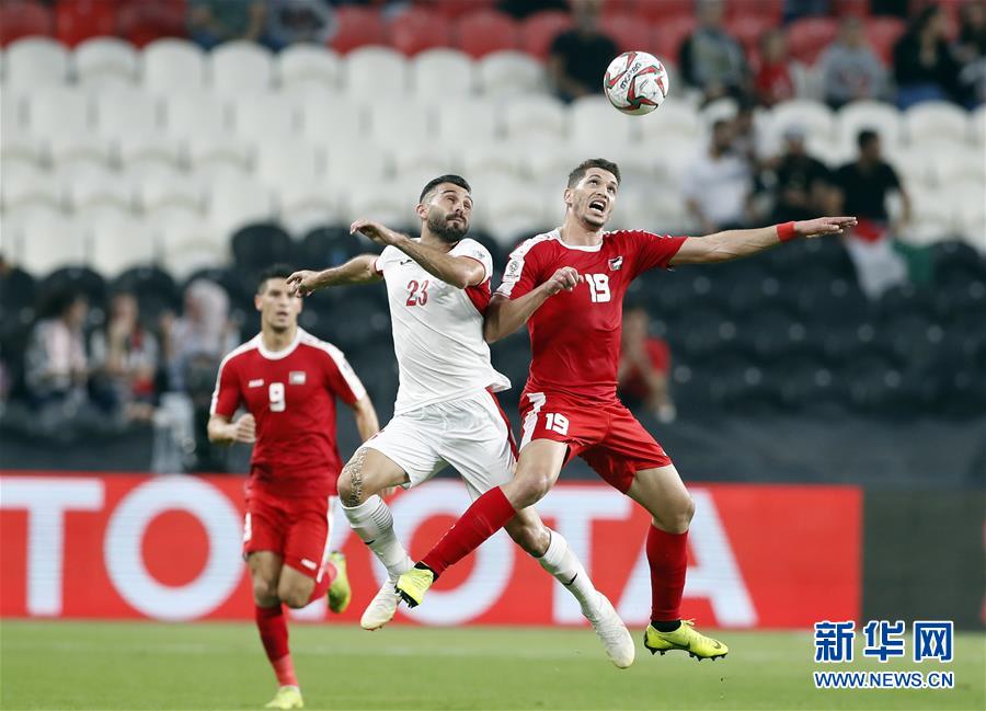 约旦队球员哈达德(中)与巴勒斯坦队球员瓦迪(右)在比赛中争顶。 新华社记者丁旭摄