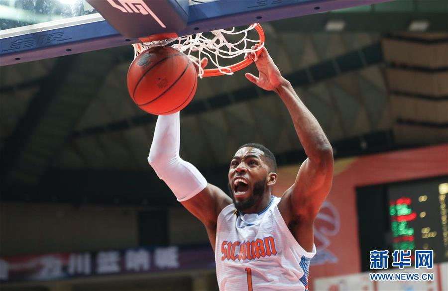 1月15日,四川五粮金樽队球员汤普森在比赛中扣篮。 当日,在2018-2019赛季中国男子篮球职业联赛(CBA)常规赛第31轮比赛中,四川五粮金樽队主场以94比105不敌吉林九台农商银行队。 新华社发