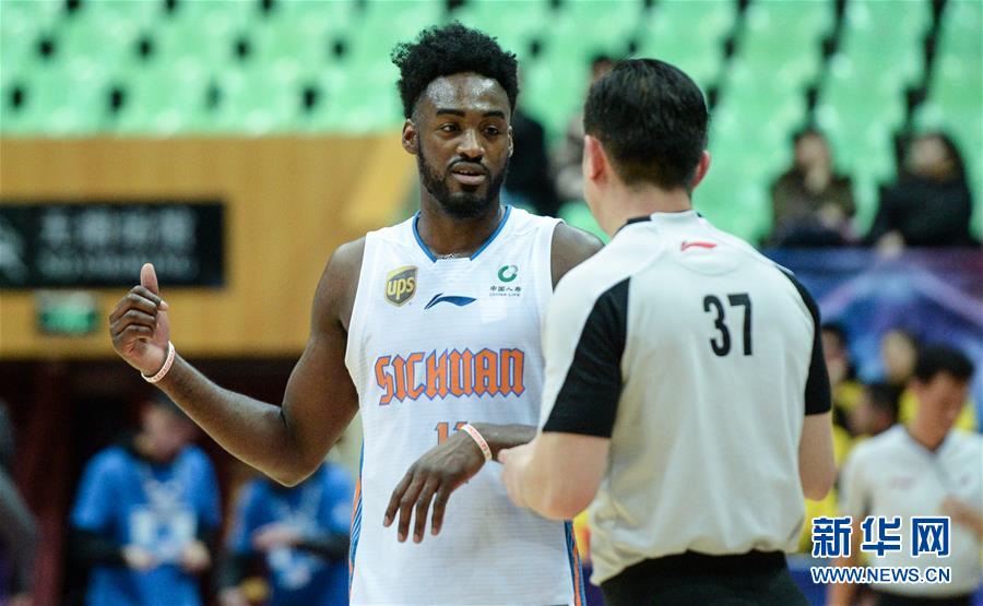 四川五粮金樽队球员富兰克林在比赛中与裁判交流。 新华社发