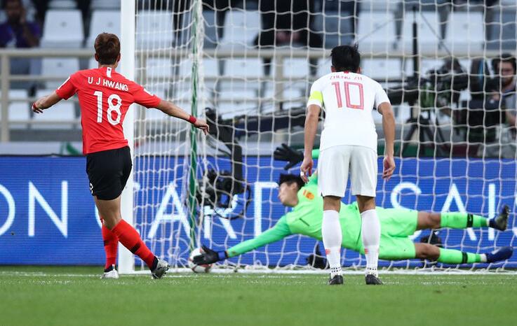 第14分钟,韩国队取得进球!孙兴慜在国足禁区内带球被石柯绊倒,裁判吹罚点球。随后黄义助主罚被颜骏凌判断对方向,但无奈球非常刁钻,从左下角擦着立柱滚进球门。国足1-0领先。