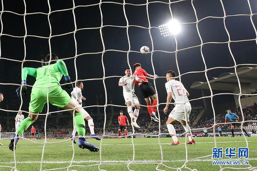 1月16日,韩国队球员金玟哉(前右二)头球得分瞬间。 当日,在阿联酋阿布扎比举行的2019亚洲杯足球赛C组比赛中,中国队以0比2不敌韩国队。 新华社记者曹灿摄