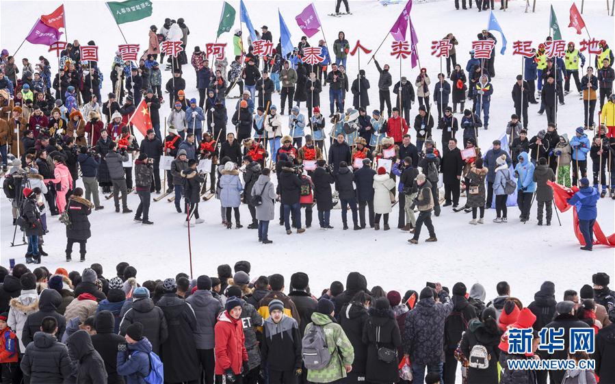 图为九位牧民到达新疆阿勒泰市将军山滑雪场,受到当地居民和雪友的热烈欢迎(1月16日摄)。 新华社记者胡虎虎摄