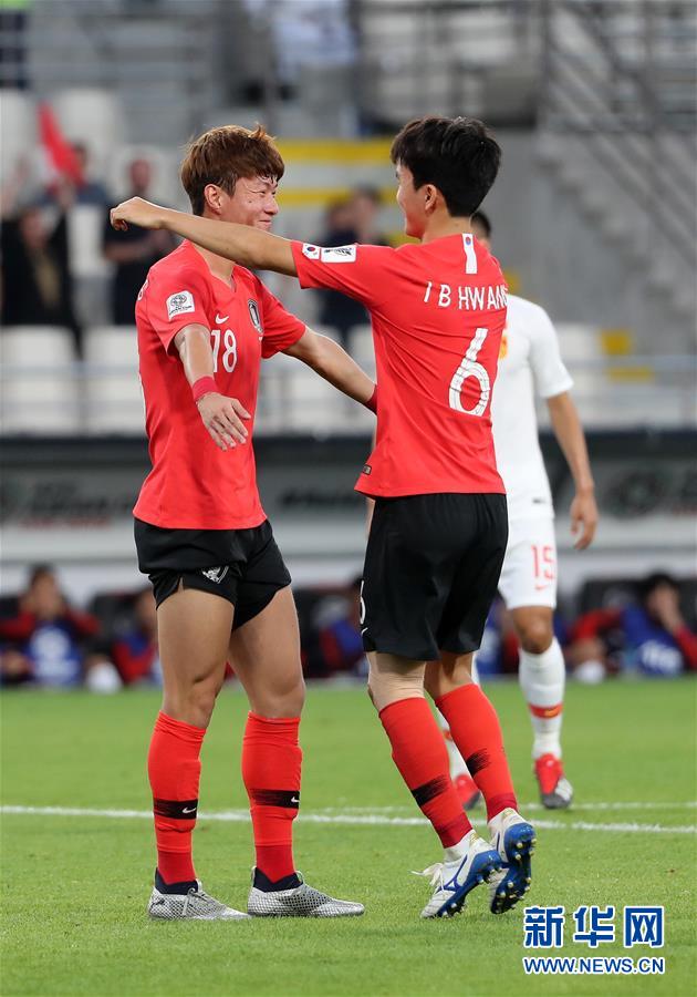 1月16日,韩国队球员黄义助(左)进球后和队友黄仁范庆祝。 当日,在阿联酋阿布扎比举行的2019年亚洲杯足球赛C组比赛中,中国队迎战韩国队。 新华社记者李钢摄