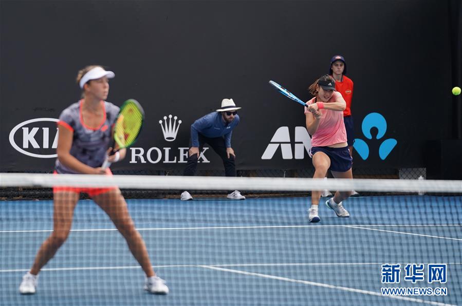 1月17日,段莹莹(右)/拉普科在比赛中。 当日,在2019澳大利亚网球公开赛女双首轮比赛中,段莹莹(中国)/拉普科(白俄罗斯)以1比2不敌科斯蒂亚(罗马尼亚)/奥斯塔彭科(拉脱维亚),无缘下一轮。 新华社记者白雪飞摄