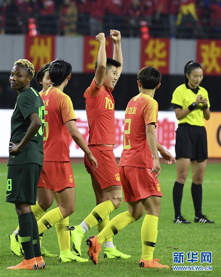 1月17日,中国队球员李影(中)庆祝进球。 当日,在广东省梅州市五华县举行的国际女足锦标赛中,中国队以3比0战胜尼日利亚队。 新华社记者邓华摄