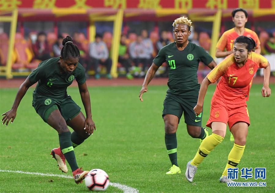 1月17日,中国队球员古雅沙(前右)在比赛中射门。 当日,在广东省梅州市五华县举行的国际女足锦标赛中,中国队以3比0战胜尼日利亚队。 新华社记者邓华摄