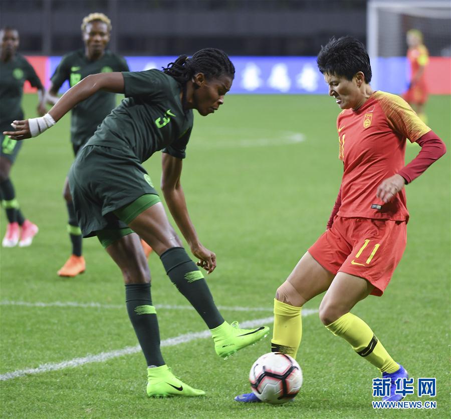 1月17日,中国队球员王珊珊(右)在比赛中带球突破。 当日,在广东省梅州市五华县举行的国际女足锦标赛中,中国队以3比0战胜尼日利亚队。 新华社记者邓华摄