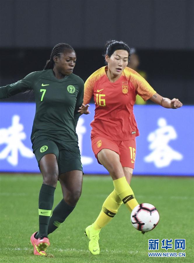 1月17日,中国队球员杨莉娜(右)在比赛中传球。 当日,在广东省梅州市五华县举行的国际女足锦标赛中,中国队以3比0战胜尼日利亚队。 新华社记者邓华摄