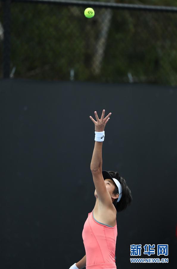 1月17日,张帅在比赛中发球。 当日,在2019澳大利亚网球公开赛女单次轮比赛中,中国选手张帅以2比0战胜捷克选手普利斯科娃,晋级下一轮。 新华社记者白雪飞摄