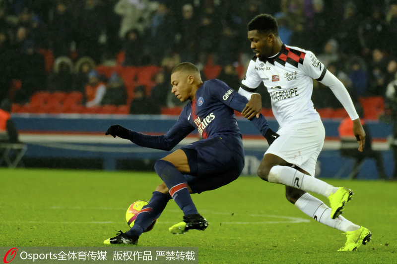 第45分钟,巴黎继续进球,埃博阿后场解围失误,球碰到卡瓦尼后来到姆巴佩脚下,姆巴佩禁区内推射破门,巴黎3-0领先甘冈!